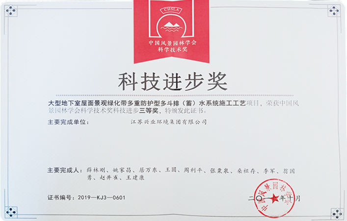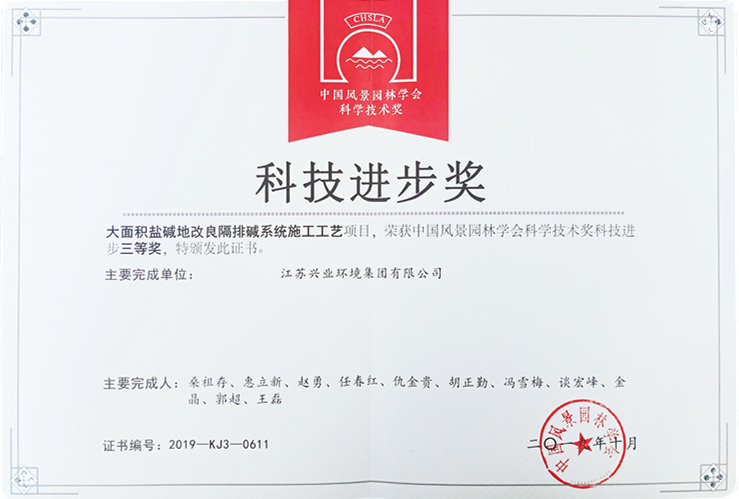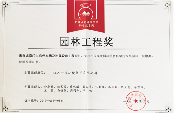 一份耕耘、一份收获。我公司“宋夹城南门生态停车场及附属设施工程”“宋夹城西门停车场及附属设施工程”分别获得2019年度中国风景园林学会园林工程奖银奖;“大型地下室屋面景观绿化带多重防护型多斗排(蓄)水系统施工工艺”“大面积盐碱地改良隔排碱系统施工工艺”分别获得2019年度中国风景园林学会科学技术奖三等奖。
