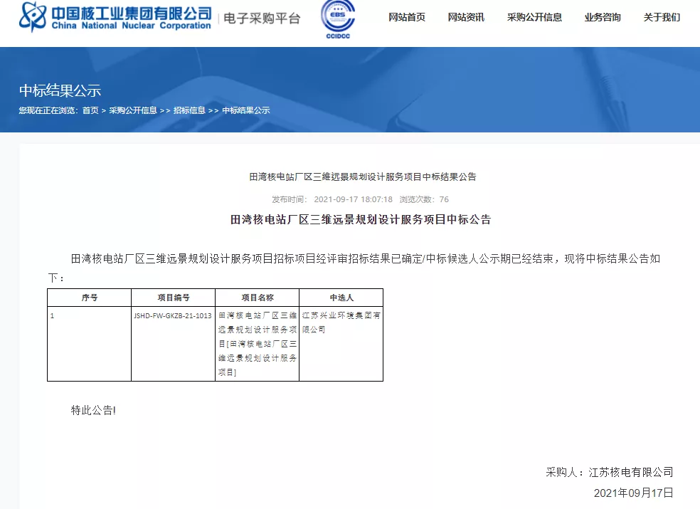 田湾核电站厂区三维远景规划设计服务项目招标人为江苏核电有限公司,服务范围为核电站现场(主厂区)、淡水厂、环境检测楼等厂区的远景规划设计工作。
