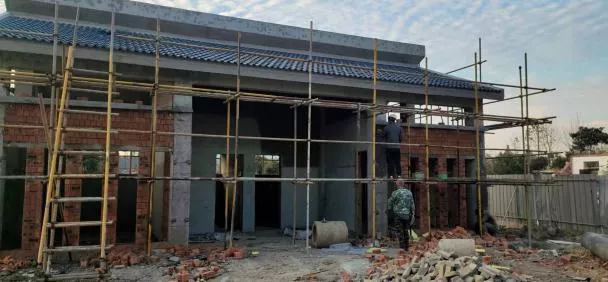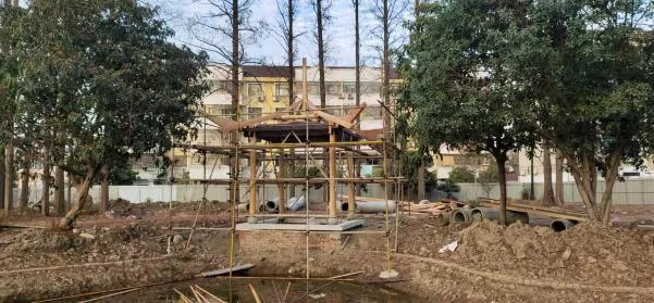 目前,该工程是建设正在如火如荼的进行,项目推进有条不紊。其重点工程千秋亭已经盖瓦完成,初现英姿。管理用房外墙砌筑,门窗混凝土浇筑。前院廊架屋面正在盖瓦施工,备受瞩目的西洋门墙身已经在砌筑,线条立模,浇筑混凝土。
