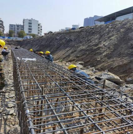 目前,该项目正在紧锣密鼓的施工中。该项目由基坑支护部分、主体结构部分、附属配套设施部分三大块组成,支护桩基础和主体结构桩基已全部施工完毕,当前正在进行基坑支护部分的冠梁、支撑梁等支撑系统施工,预计4月份完成全部冠梁支撑梁施工,4月中下旬进行基坑开挖、主体结构施工。