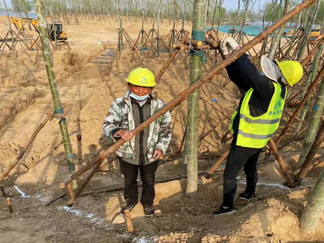 河南省周口市淮阳区龙湖·苏花园田湾片区生态修复及景区提升工程目前各分区清理、填埋、种植、打支撑等绿化工作进行中,园建方面同步推进。