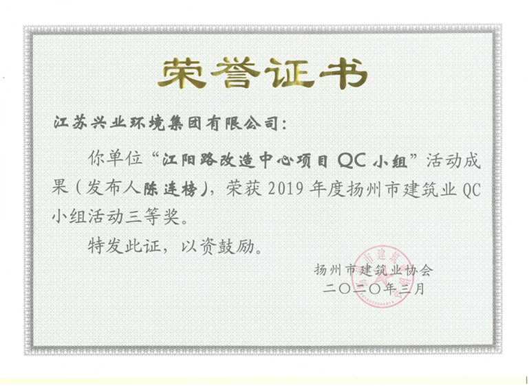 2019年度扬州市建筑业QC活动小组活动三等奖--”江阳路改造中心项目QC小组“