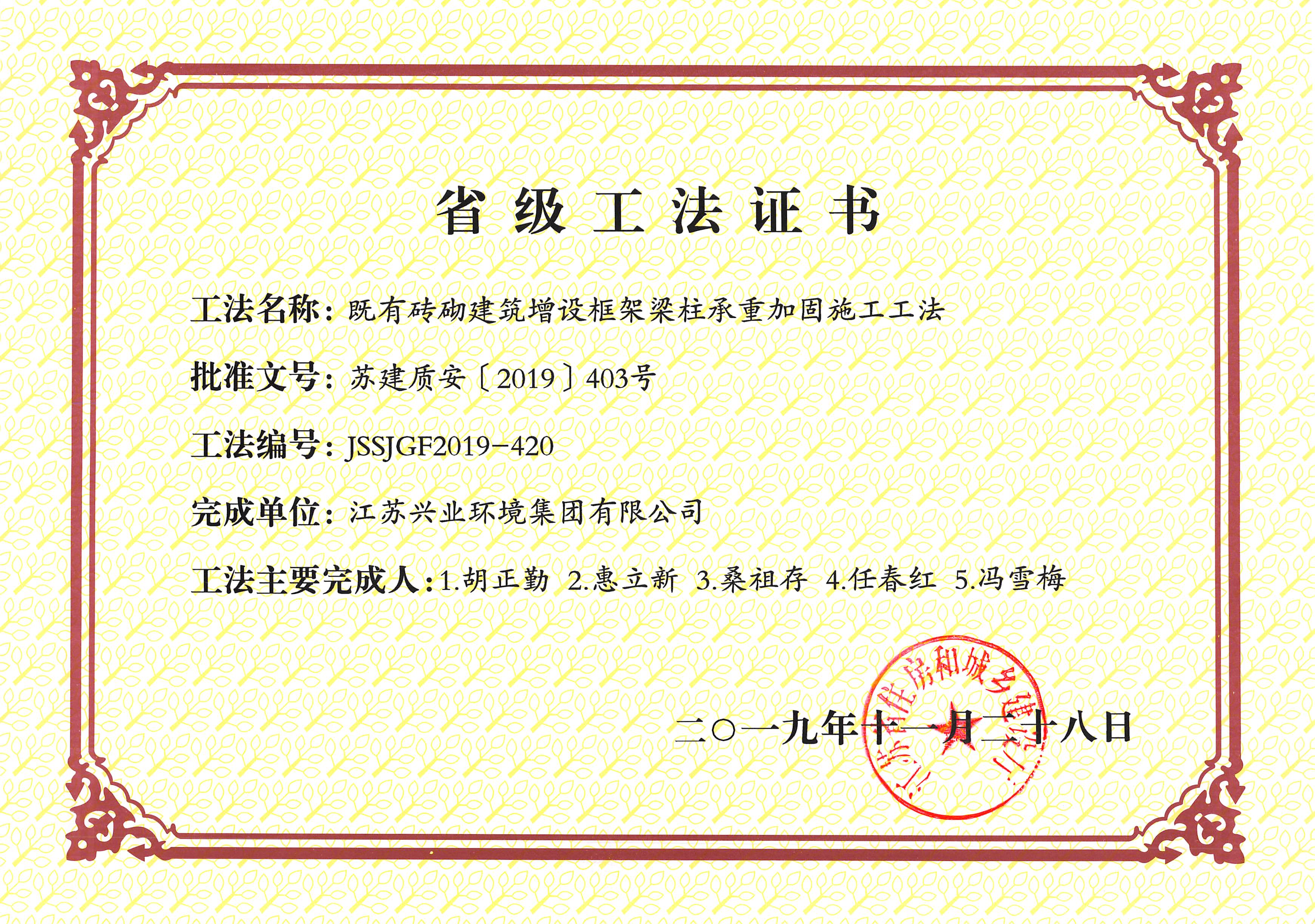 2019年省级工法(即有砖砌建筑增设框架梁柱承重加固施工工法)