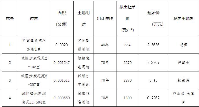 经高邮市人民政府批准,高邮市自然资源和规划局决定委托扬州市公共资源交易中心高邮分中心以协议方式出让4宗国有建设用地使用权。现根据有关法律、法规和国土资源部《协议出让国有土地使用权规范(试行)》的规定,本着公开、公平、公正的原则,将拟出让地块的有关情况公示如下。